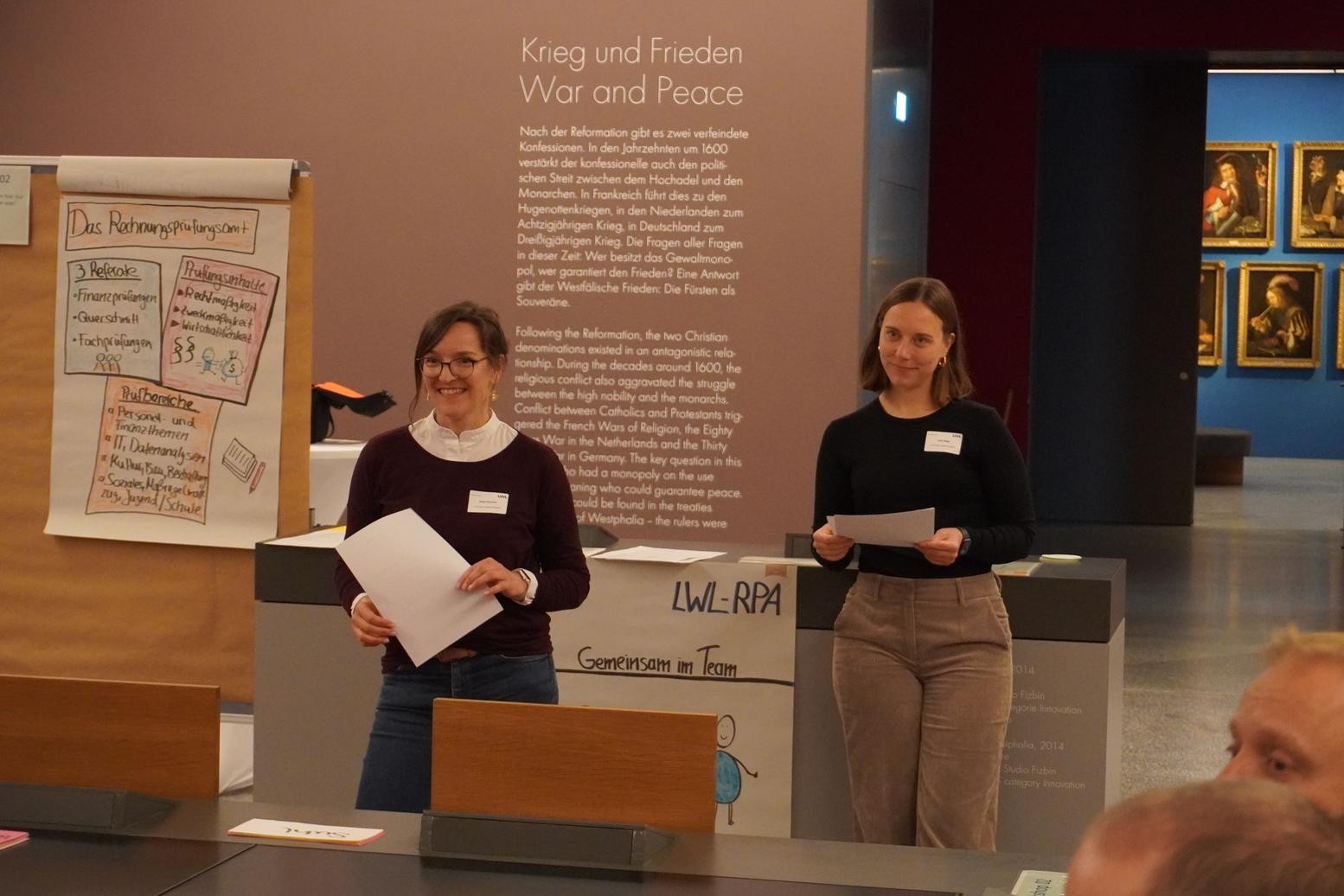 In zwei Workshops stellten Katja Gehrken, Referatsleiterin für Finanzprüfungen, und Julia Nega, Senior-Prüferin, den interessierten Teilnehmerinnen und Teilnehmern (im Raum „Krieg und Frieden“ des LWL-Museums für Kunst und Kultur) vor, warum, wie und mit welchen Zielen das LWL-RPA dafür Sorge trägt, dass der LWL ordnungsgemäß unterwegs ist. Neben Einblicken in den organisatorischen Aufbau des LWL-RPA präsentierten die beiden Kolleginnen interaktiv den Prüfungsablauf und spannende Informationen rund um die Rechnungsprüfung sowie den LWL.